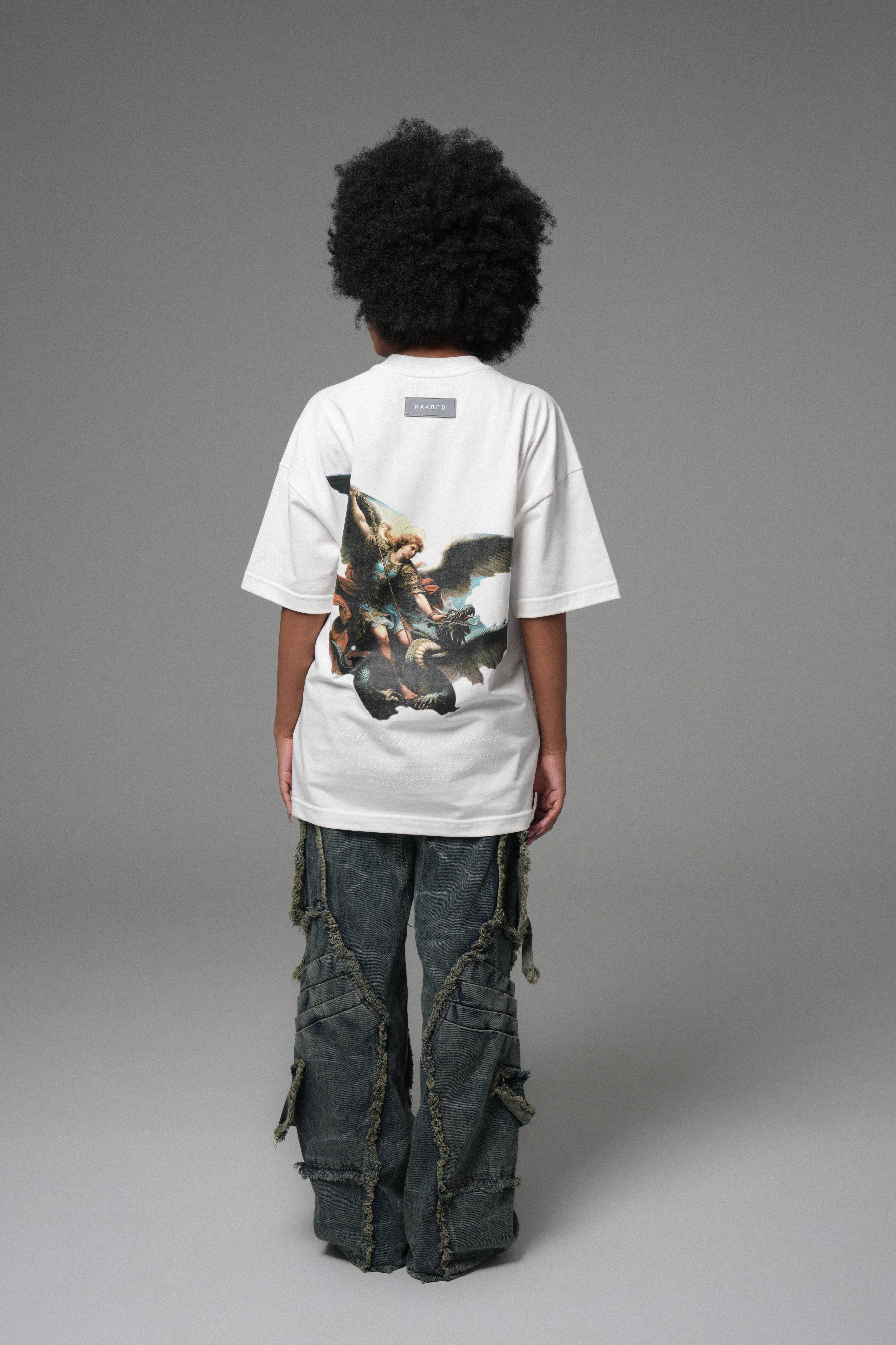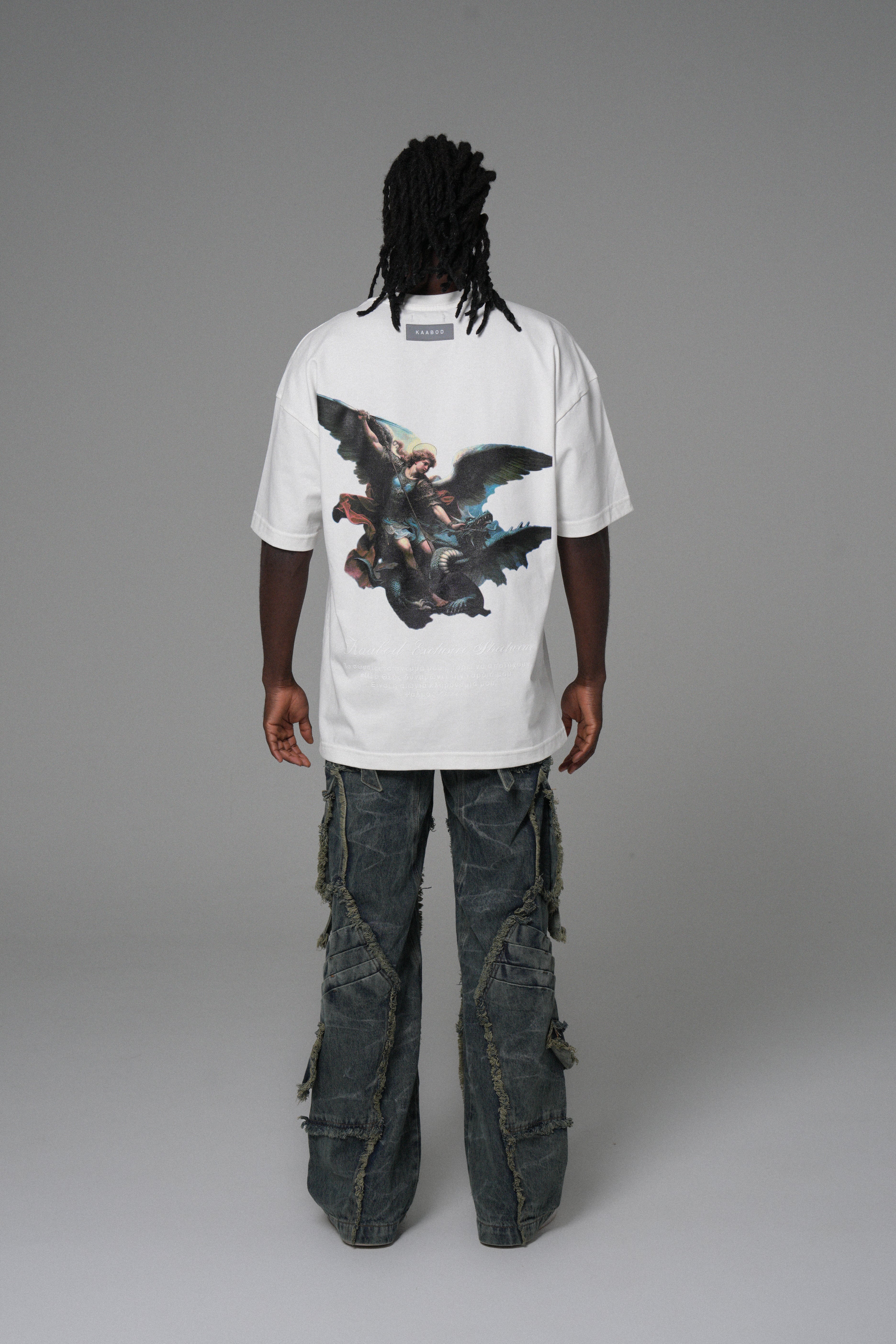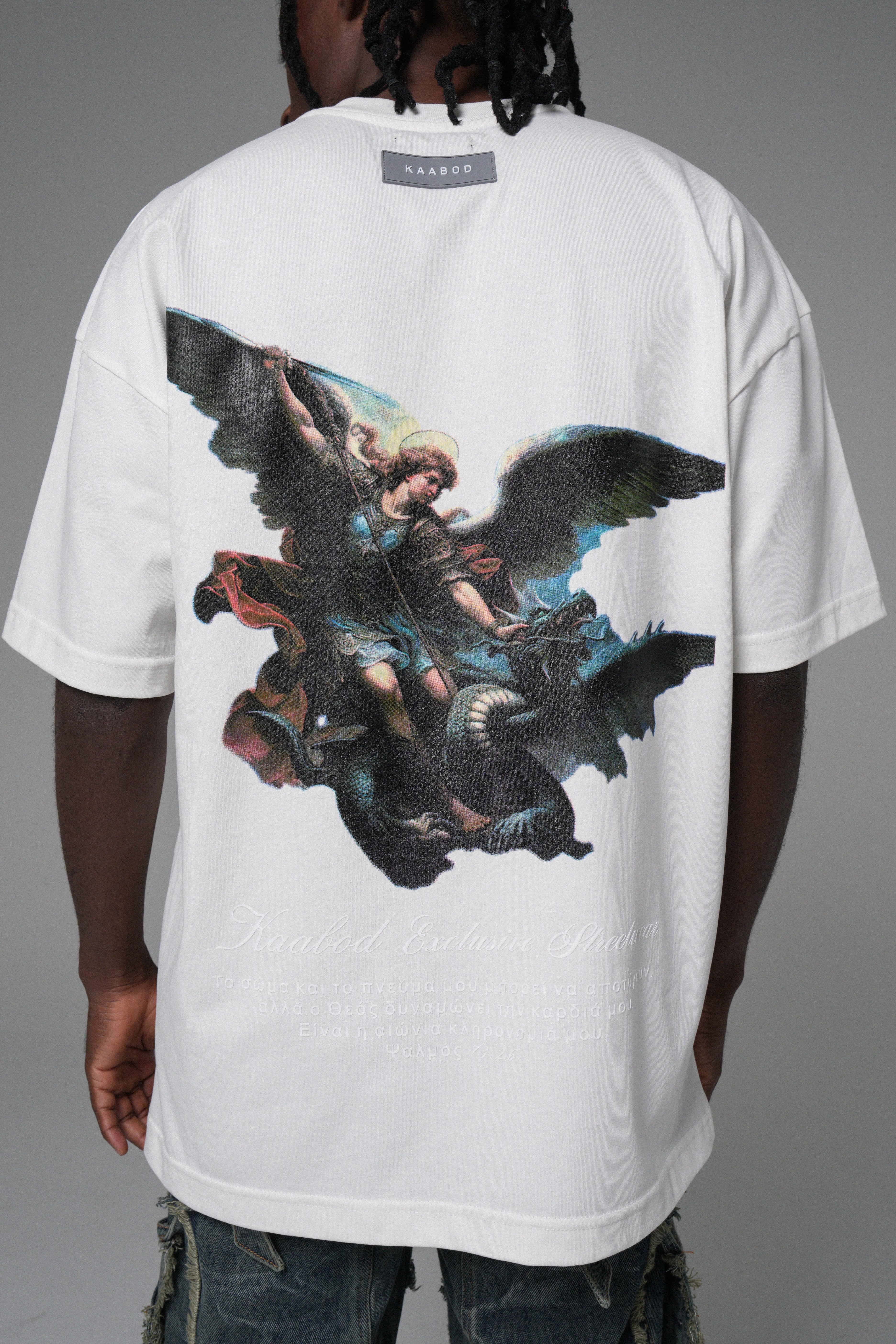 En la espalda: Arcángel en policromía con acabado nítido, y texto inferior en alta densidad para cerrar el diseño con carácter.