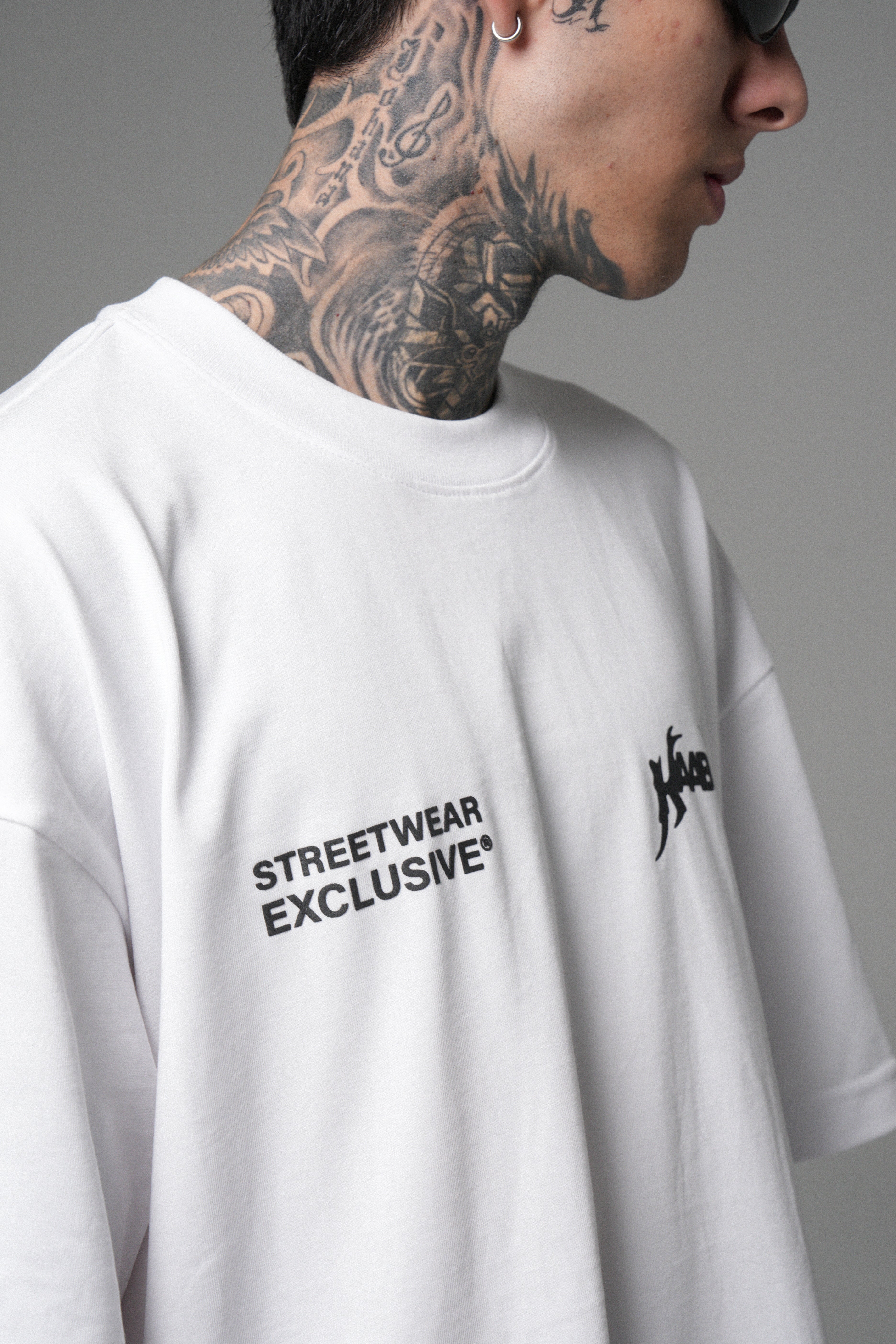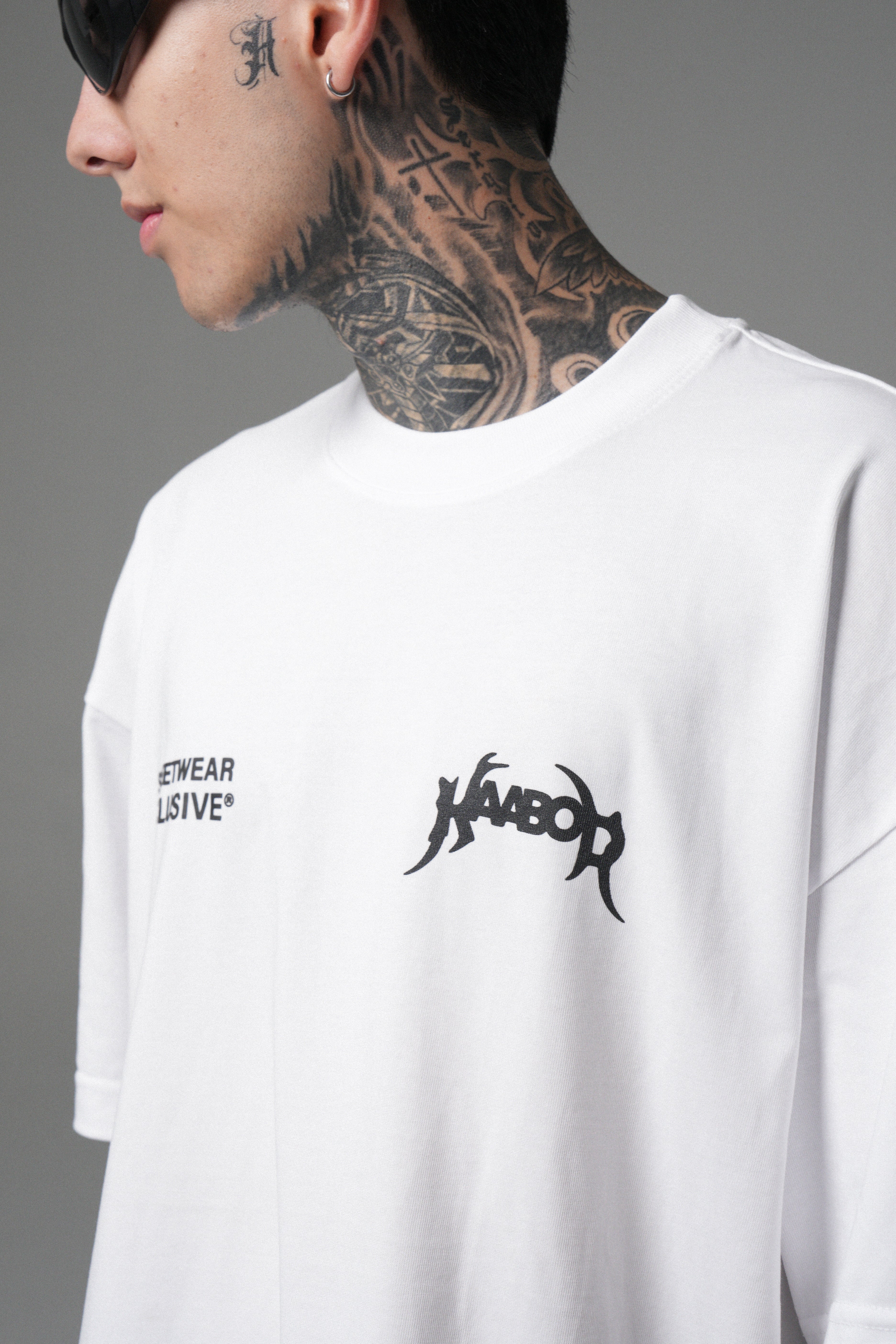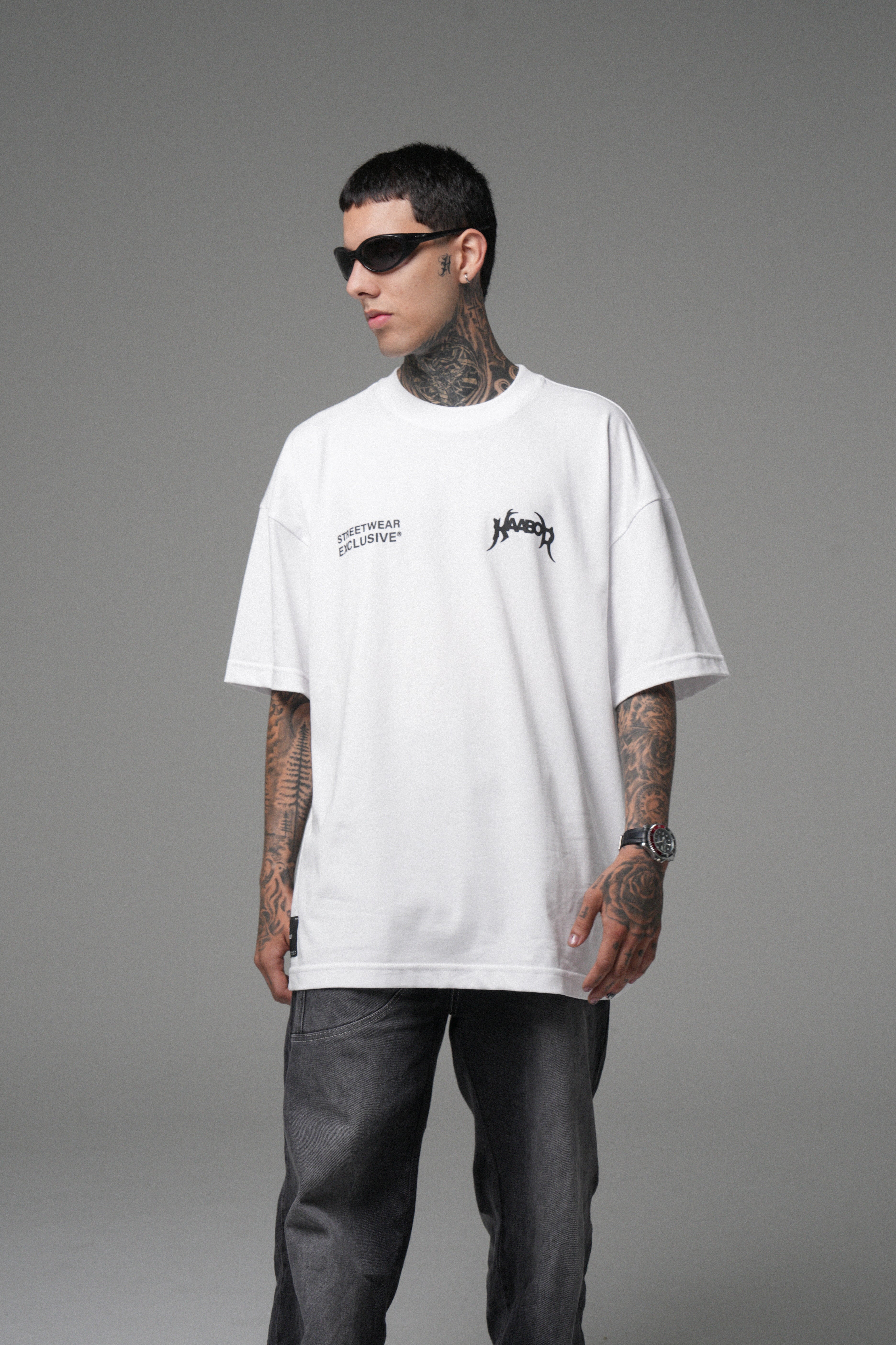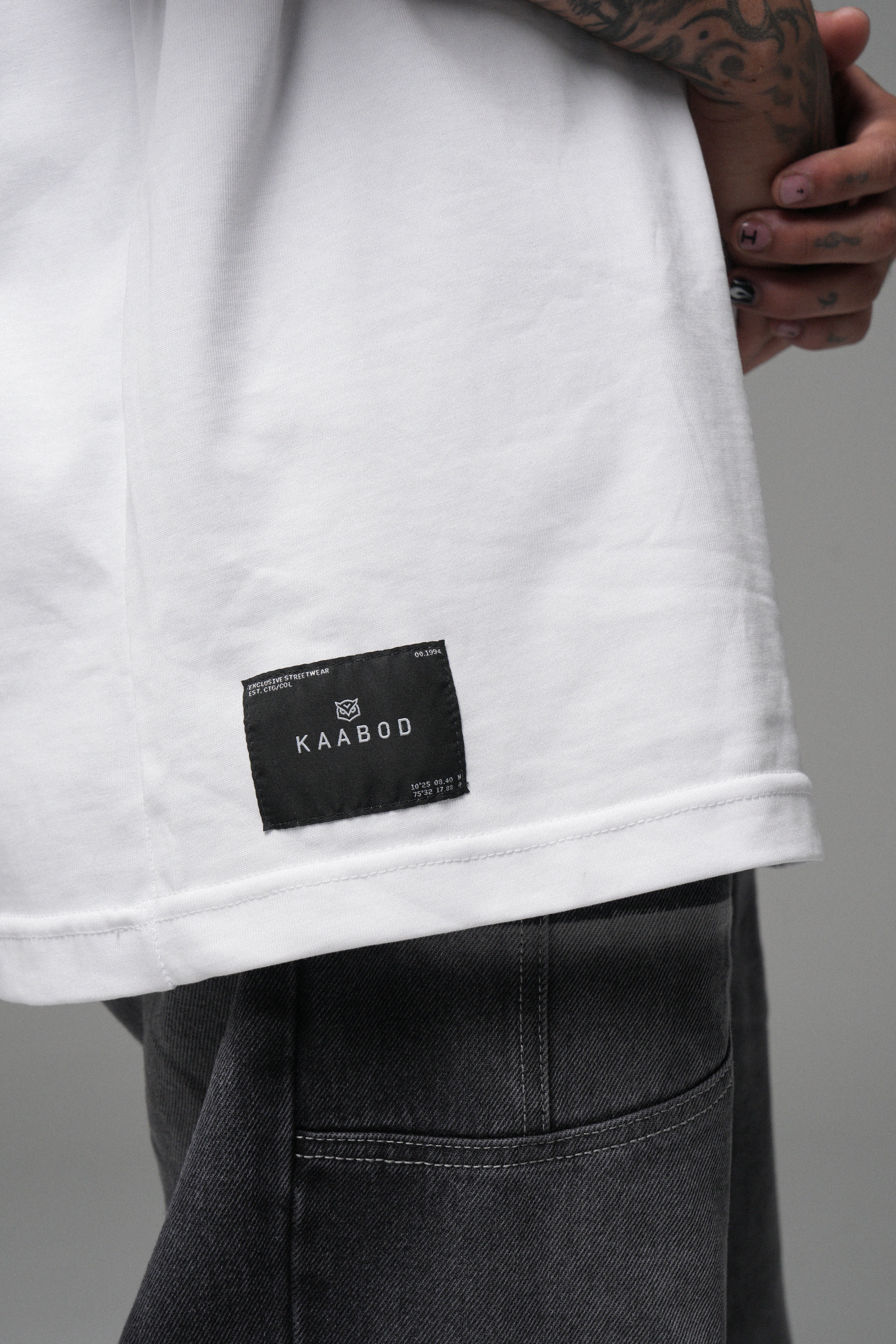 Blanco limpio, presencia alta. Algodón peruano 270g con caída premium, cuello Rib de alta calidad y estampado en alta densidad para un contraste nítido. Minimalismo con intención.