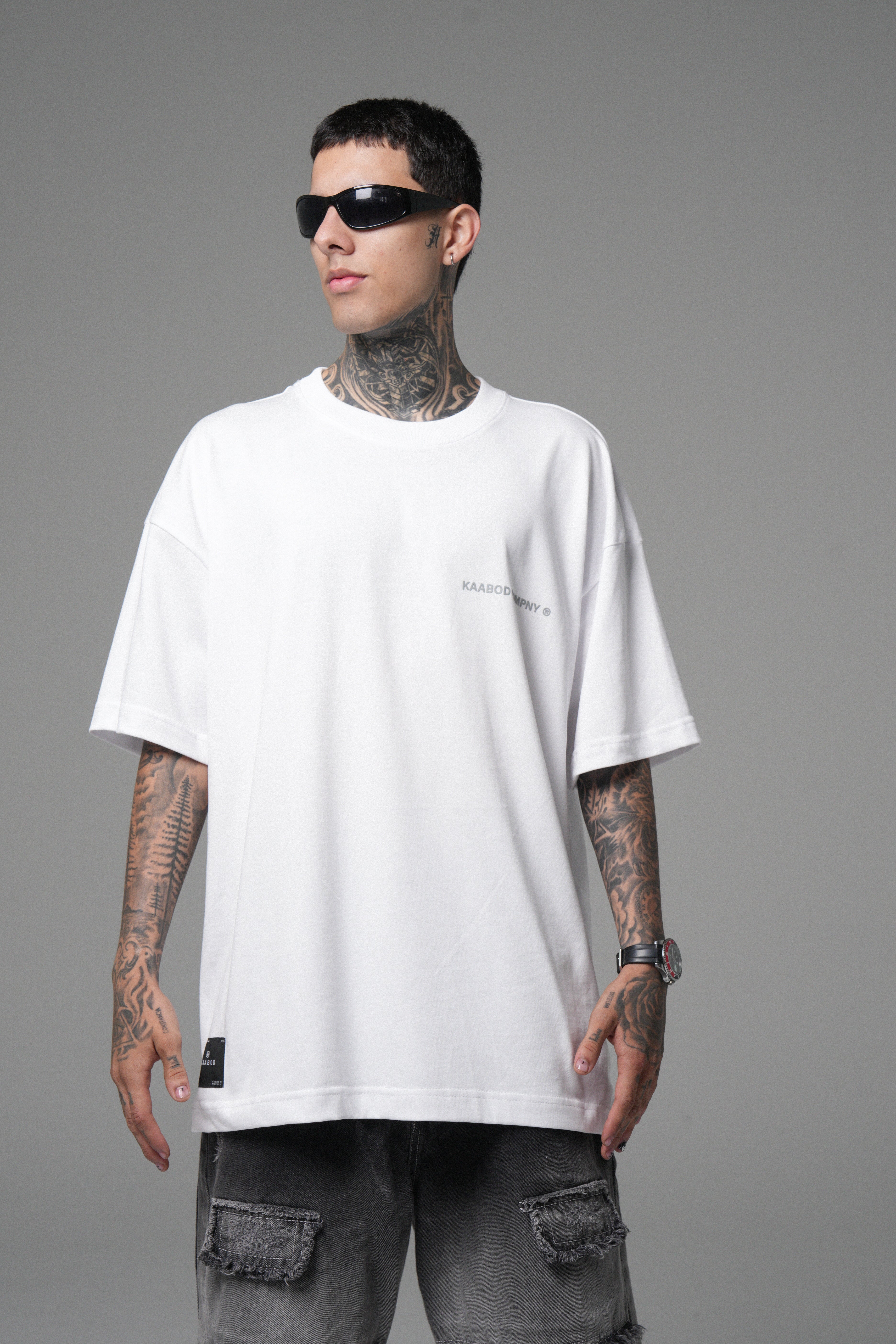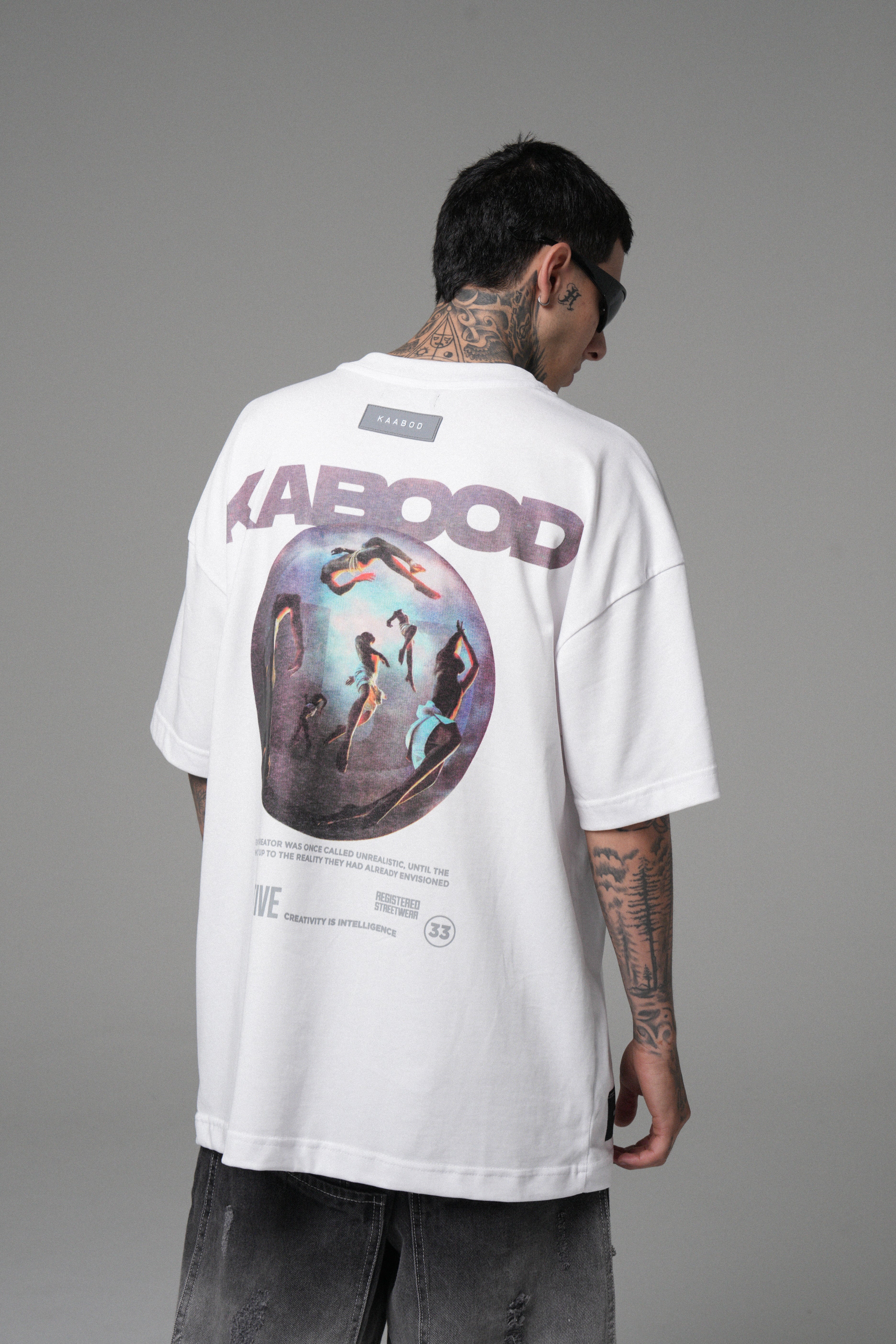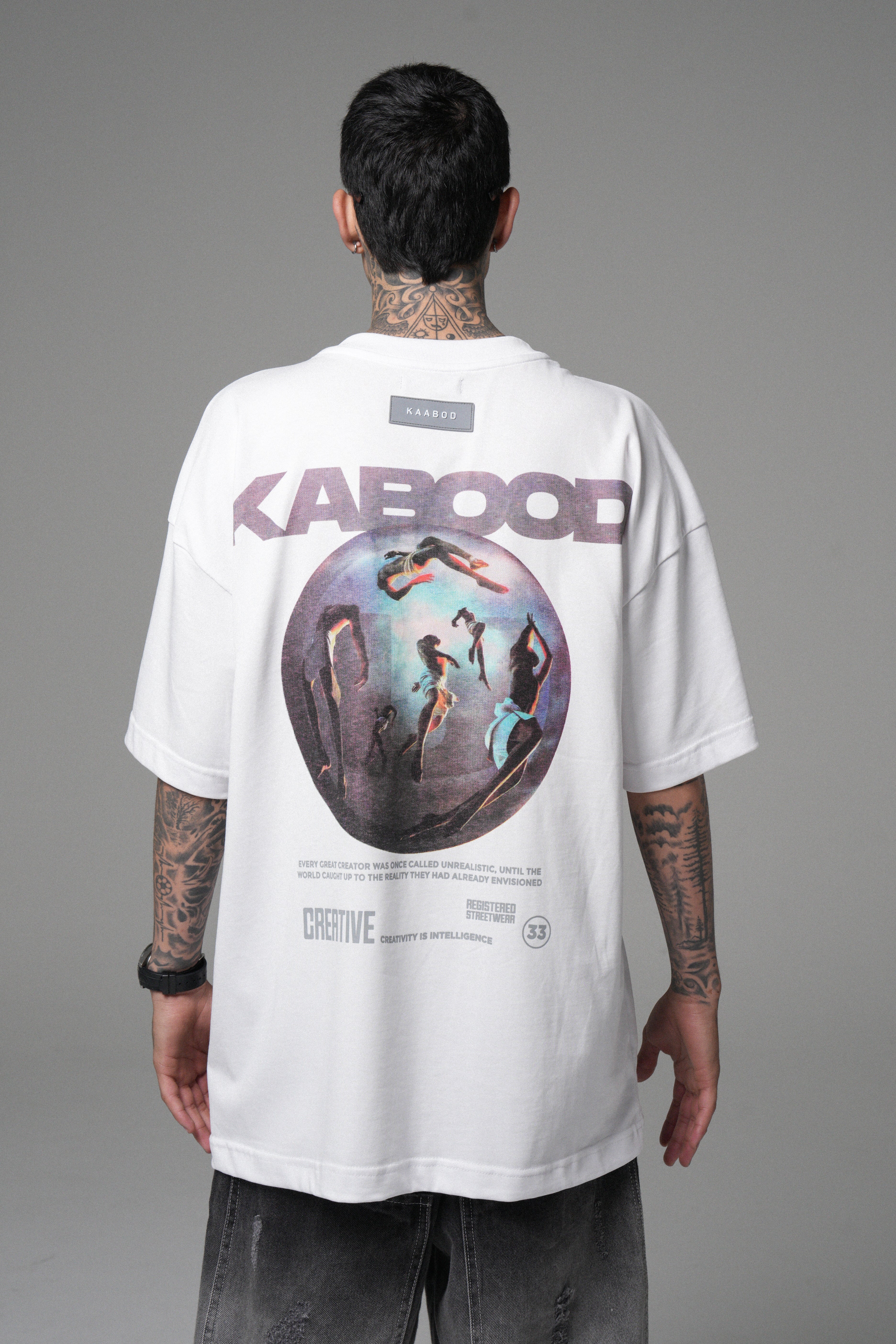 Camiseta Kaabod Creative Blanca 270g. Algodón peruano, cuello Rib premium, logo frontal en alta densidad y estampado trasero en policromía.