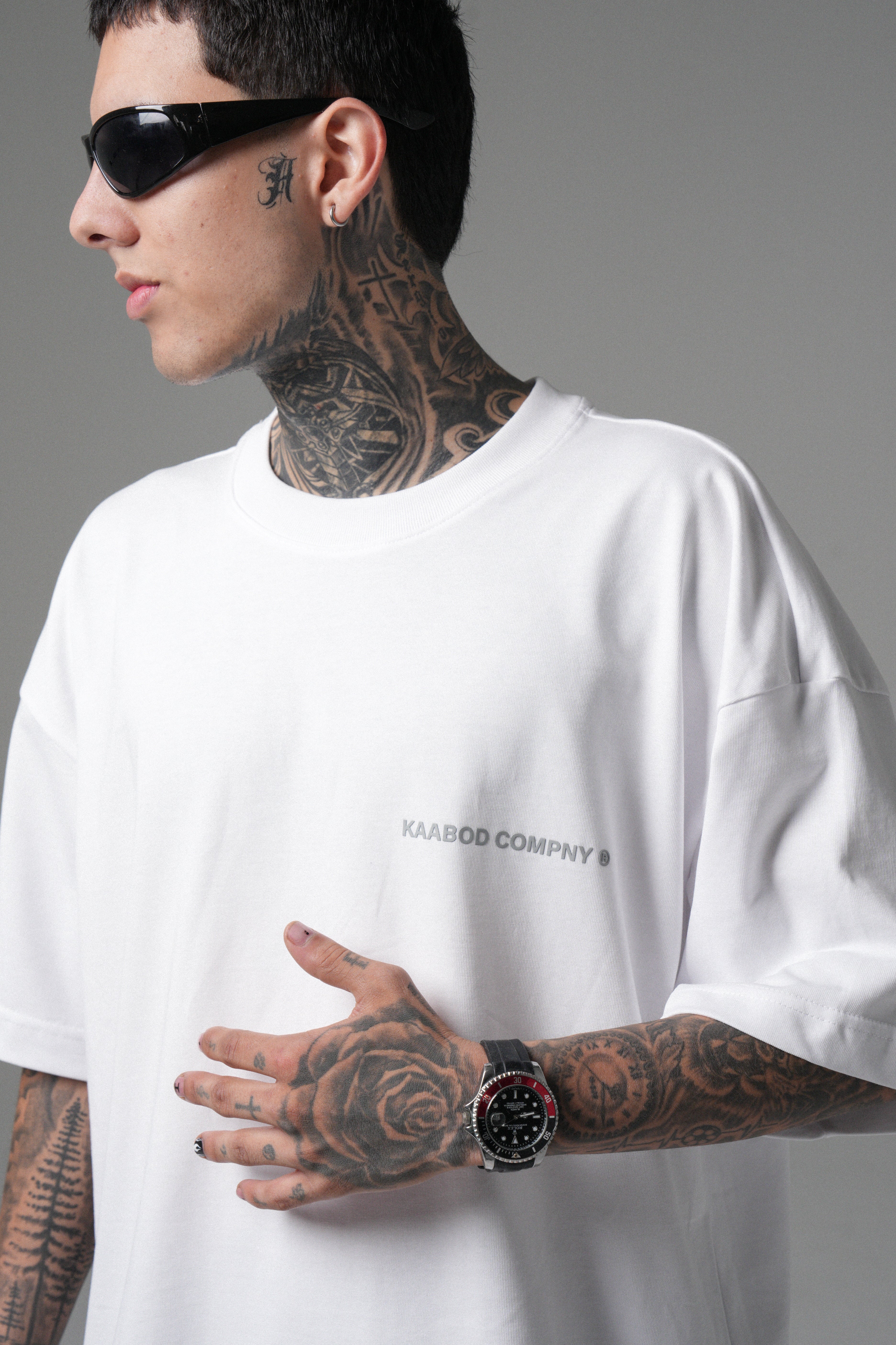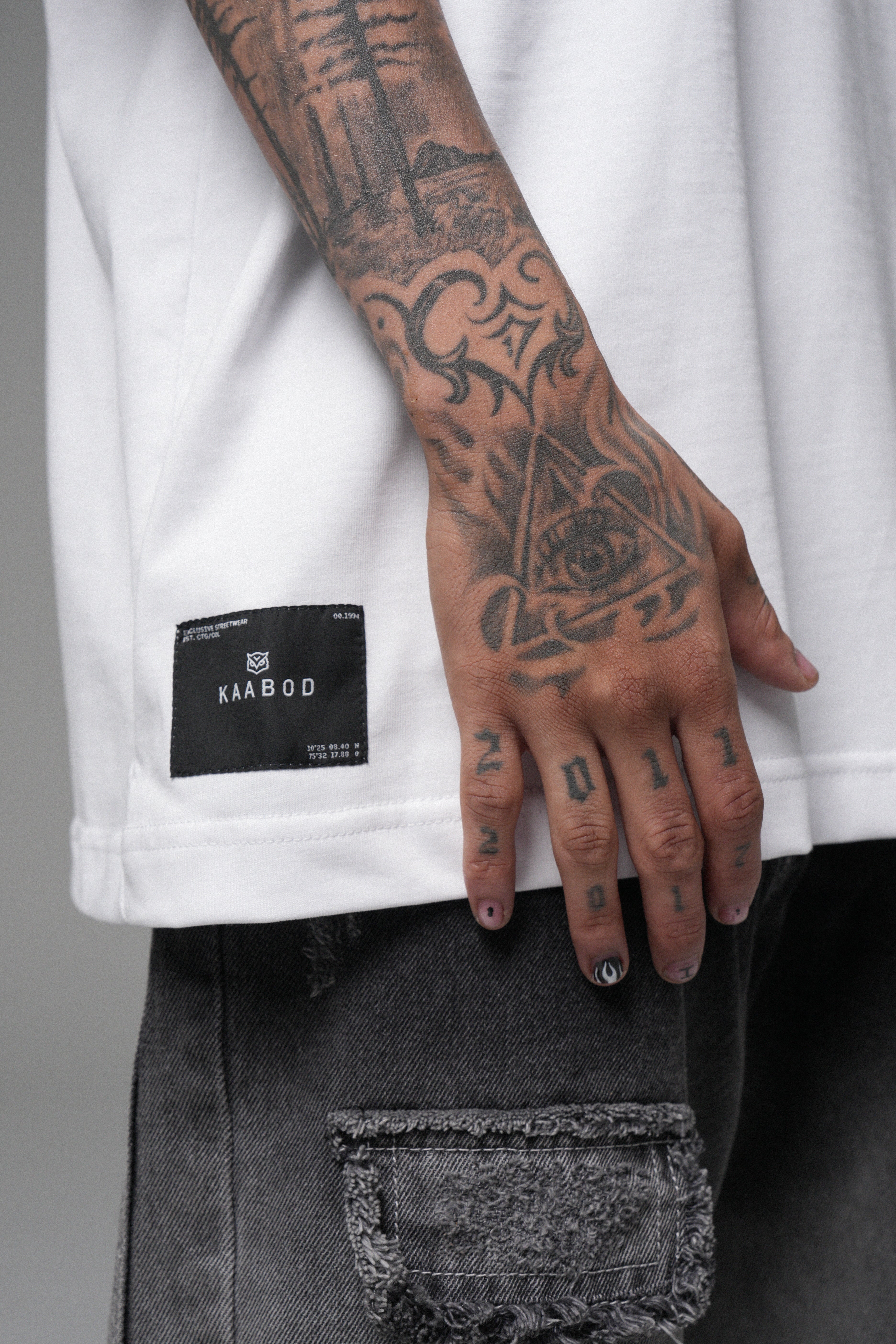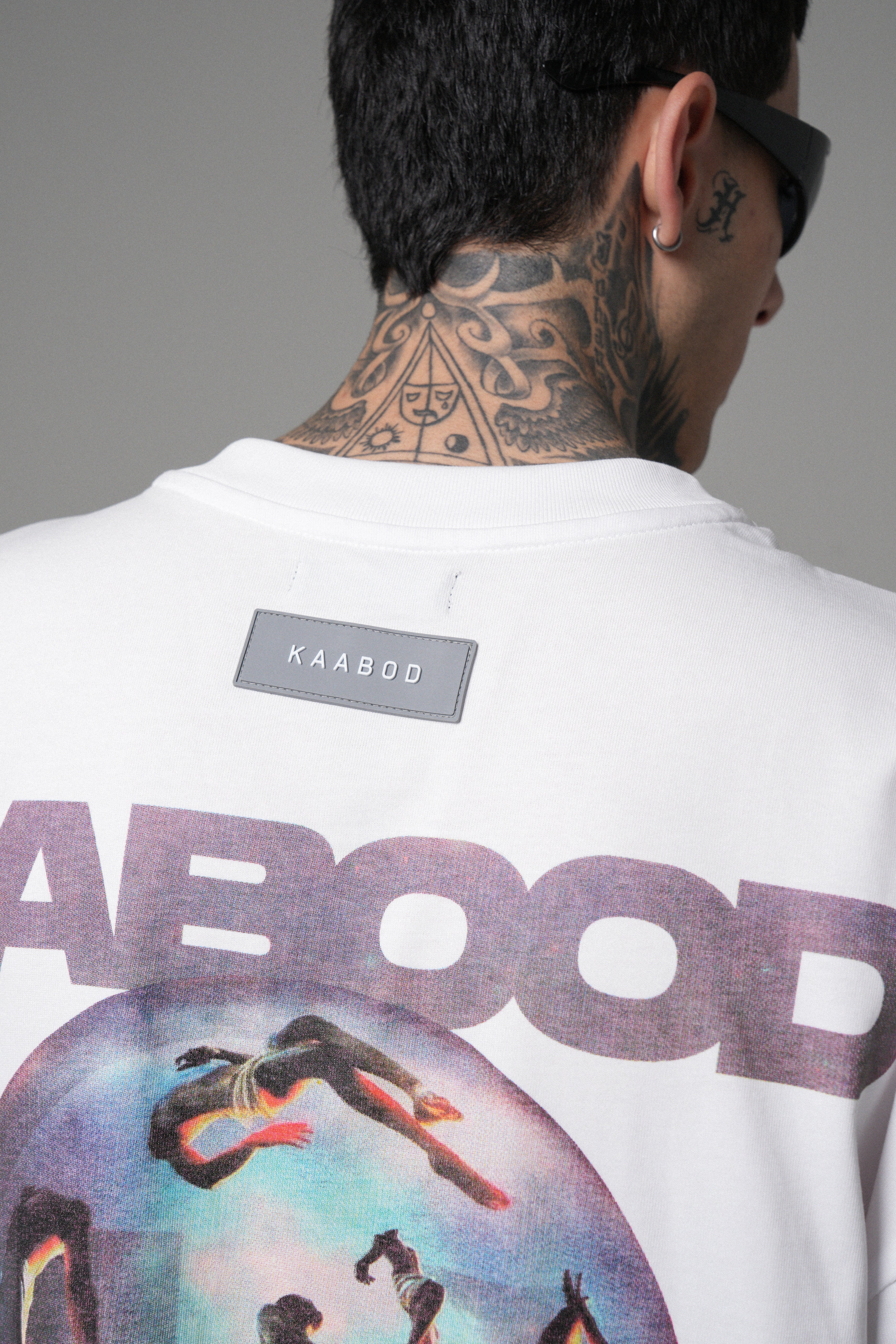 Camiseta Kaabod Creative Blanca 270g. Algodón peruano, cuello Rib premium, logo frontal en alta densidad y estampado trasero en policromía.