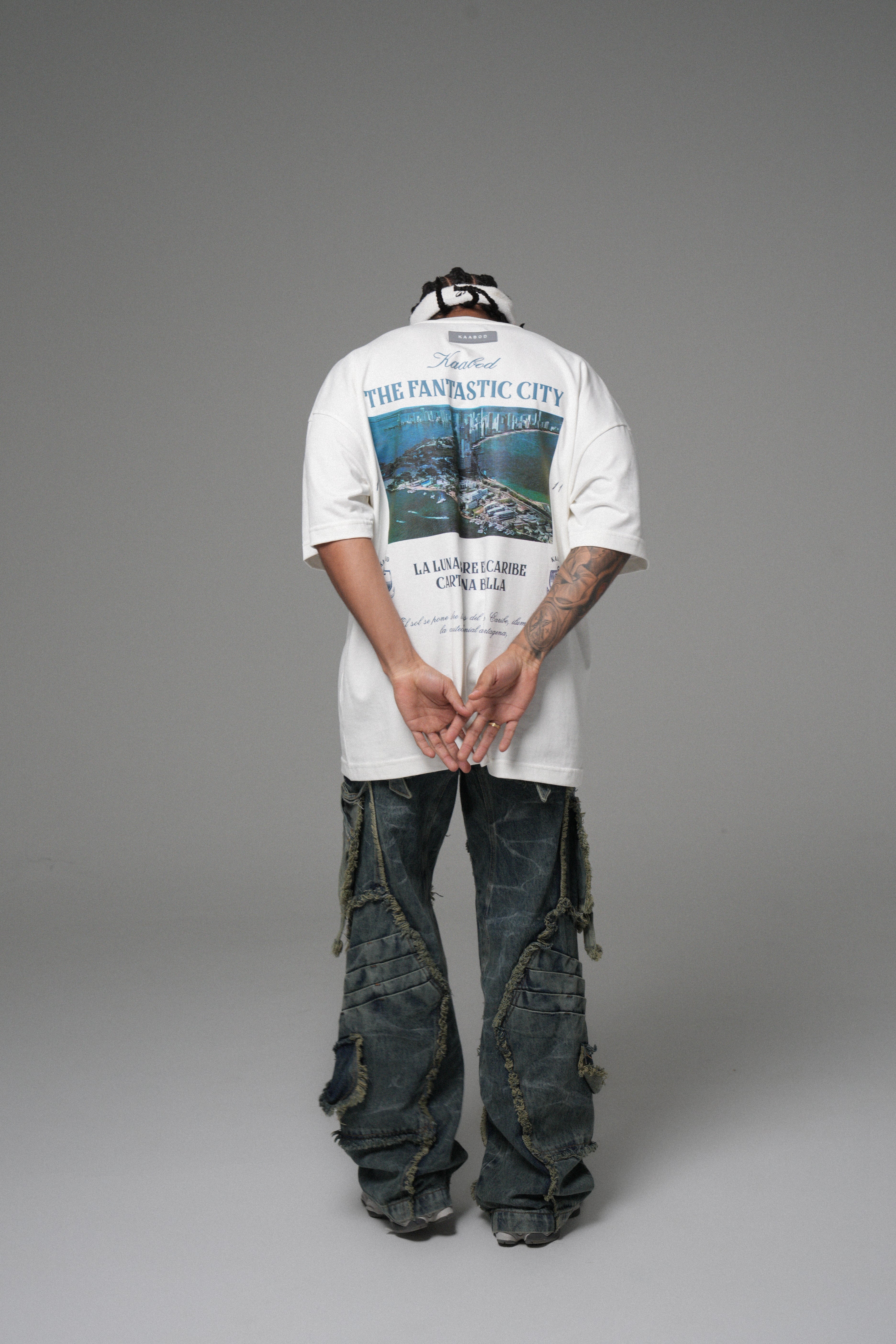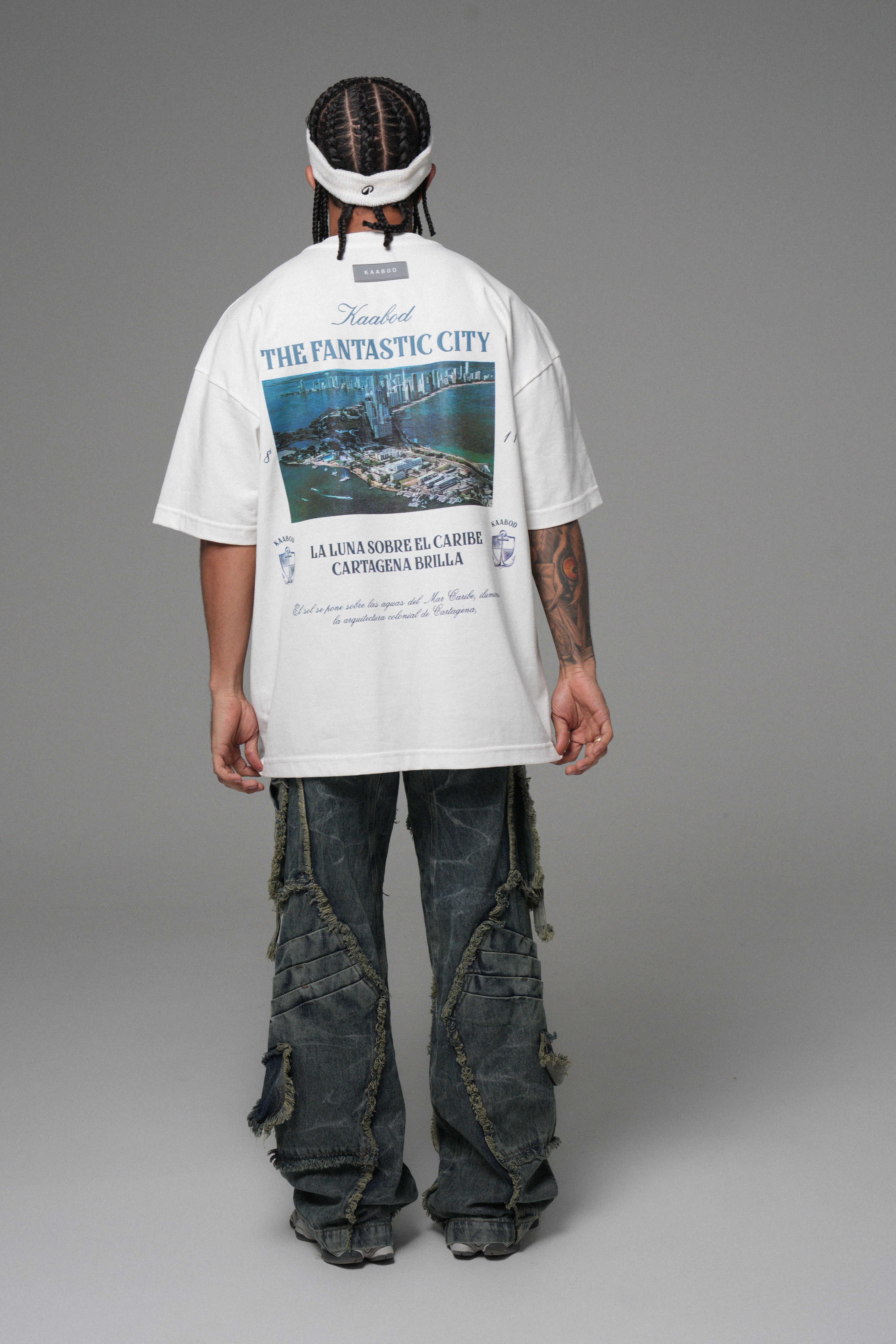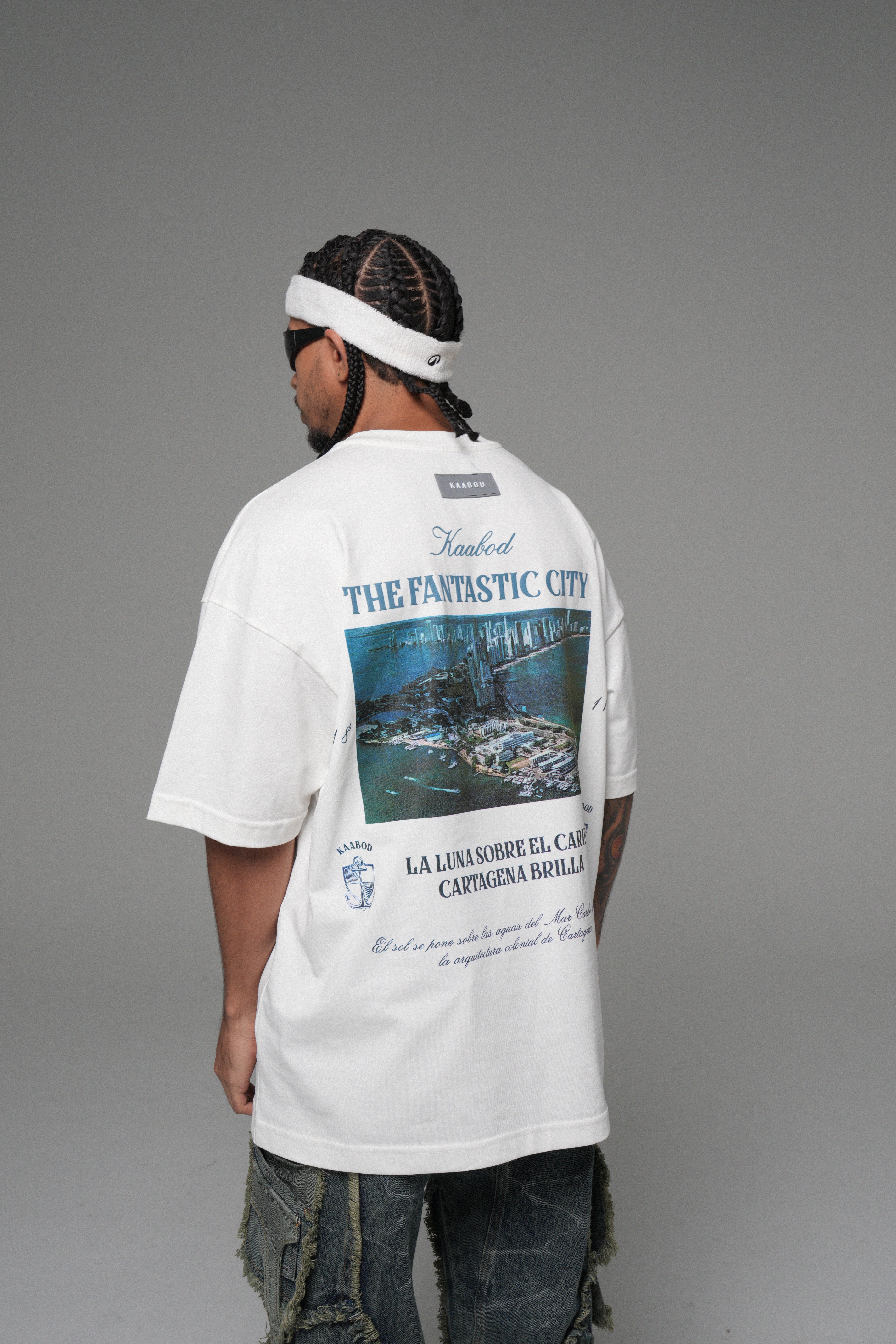THE FANTASTIC CITY en alta densidad tono a tono: branding sutil, elegante y con textura premium. En la espalda, el corazón del Drop: postal de Cartagena en policromía, con detalles gráficos y tipografía clásica que capturan esa vibra costera —calle, mar y ciudad— que te marcó desde el origen.