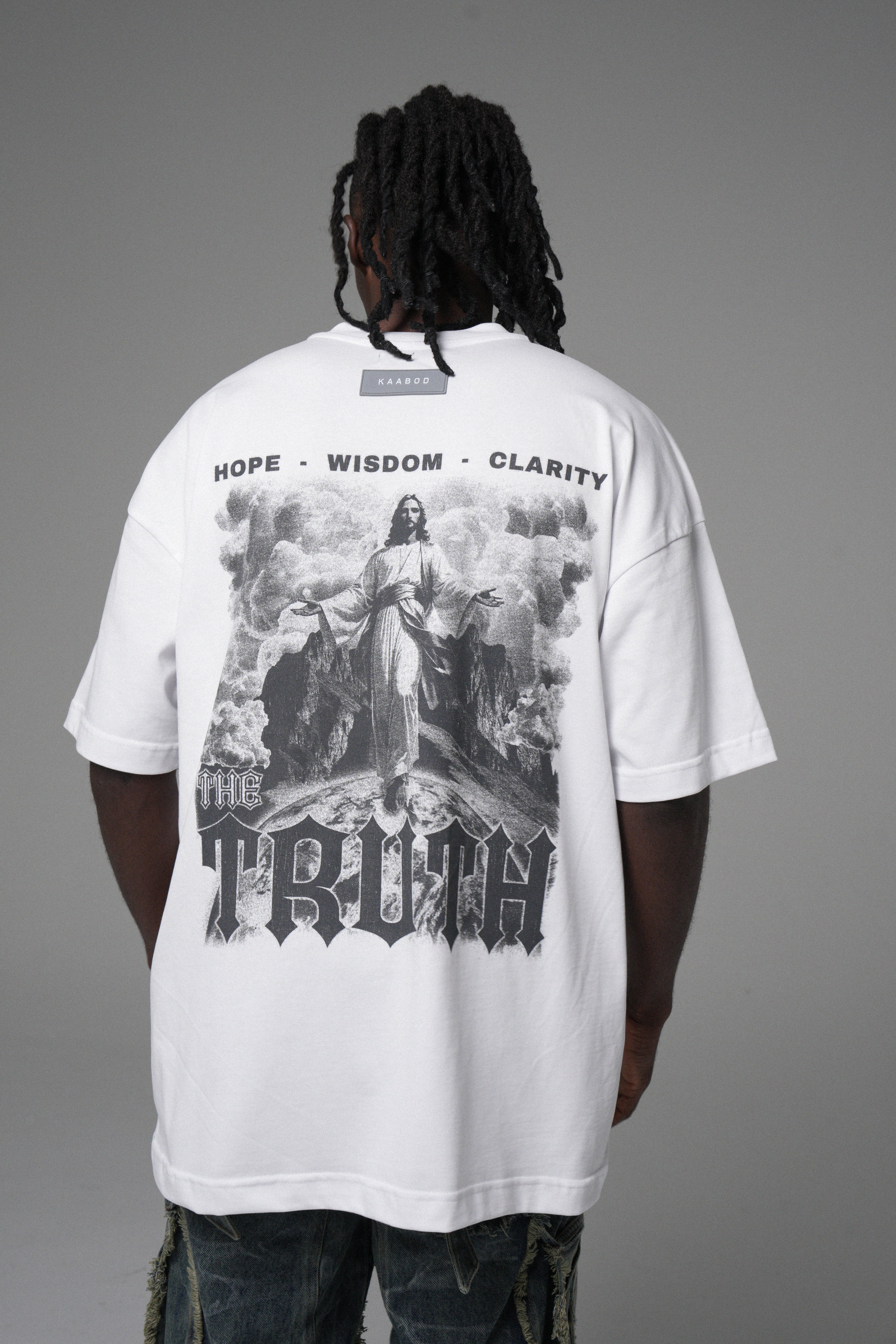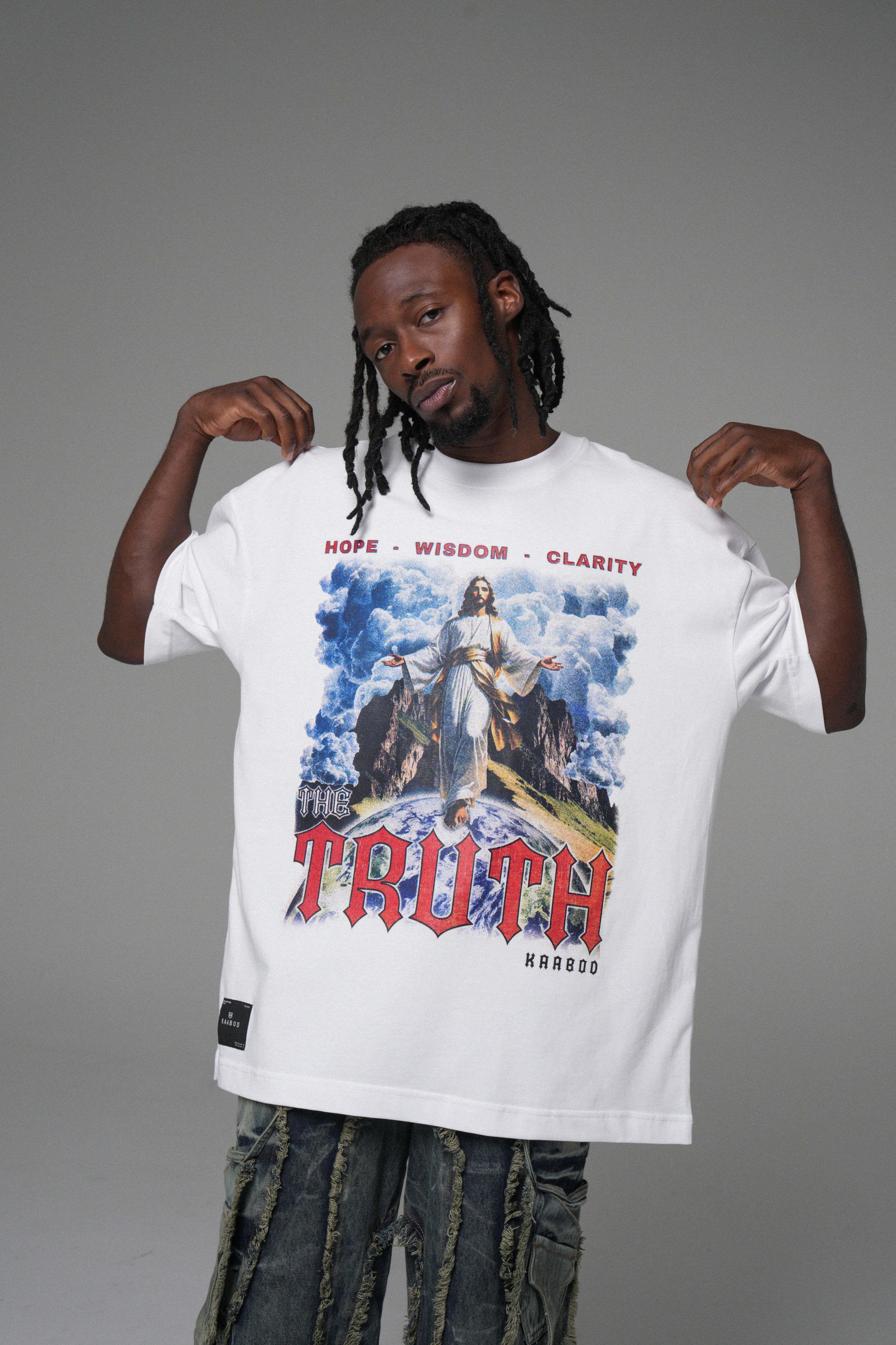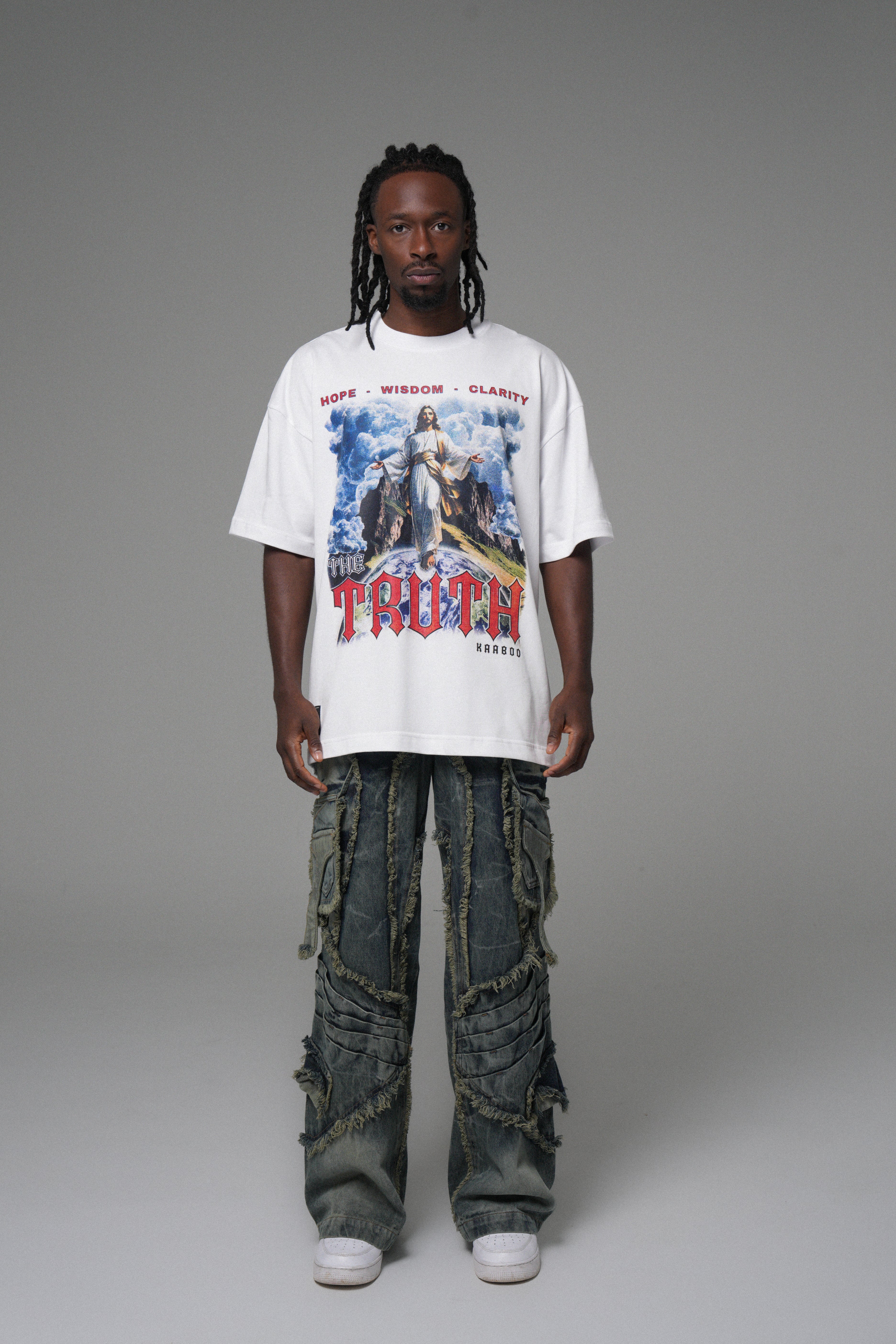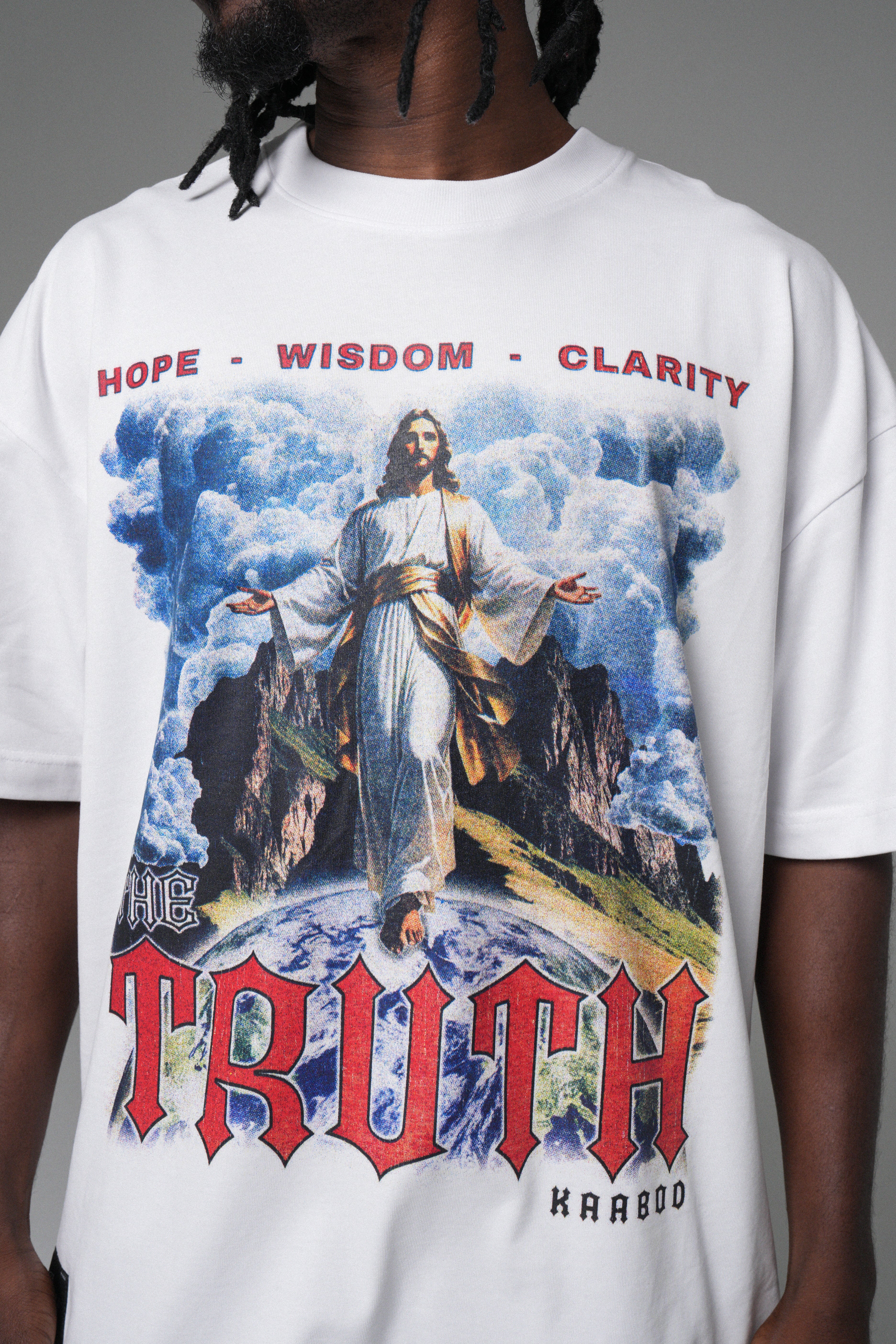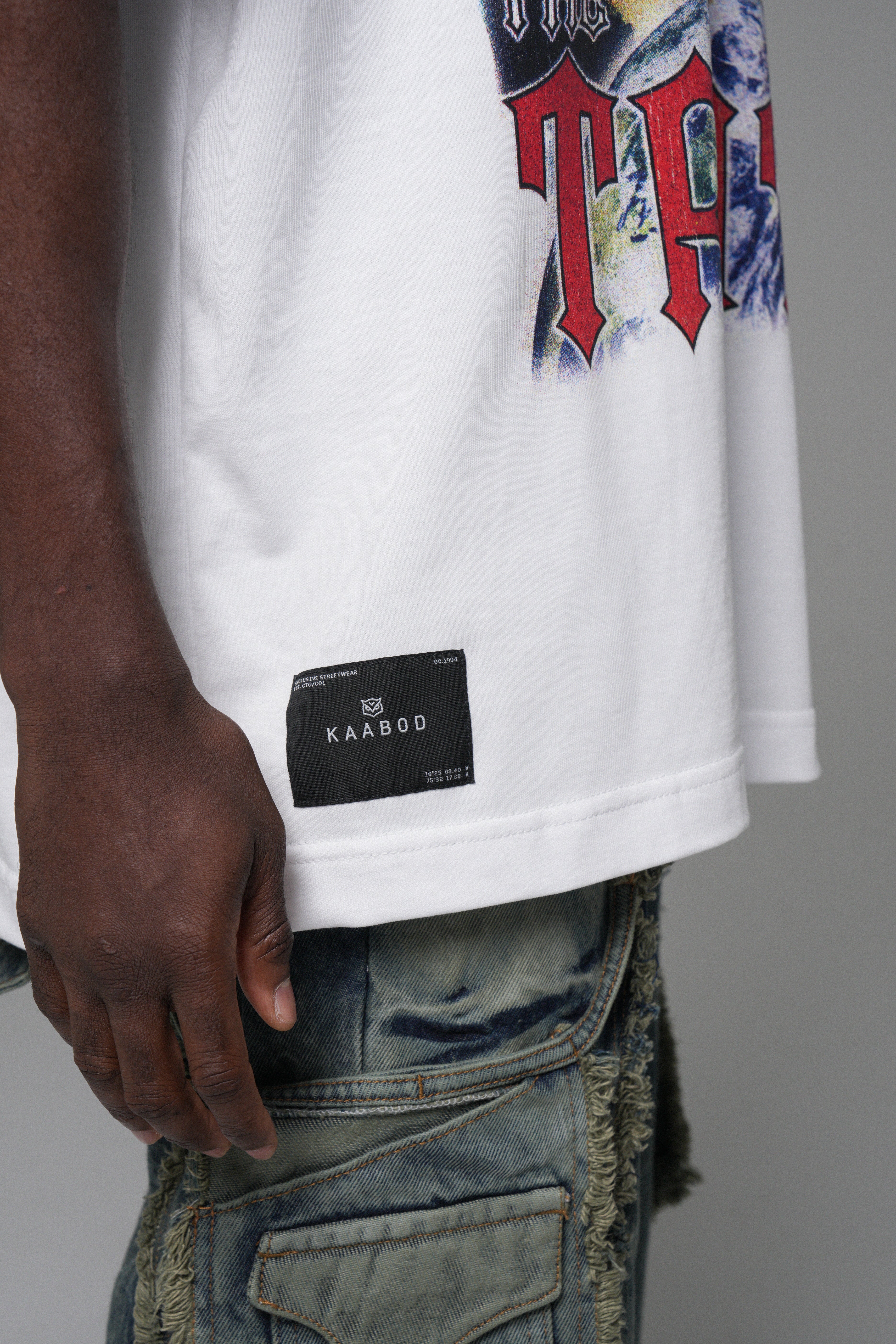 Algodón peruano 270g con cuerpo y caída limpia, cuello en rib premium y un estampado en policromía que mantiene detalle y lectura.